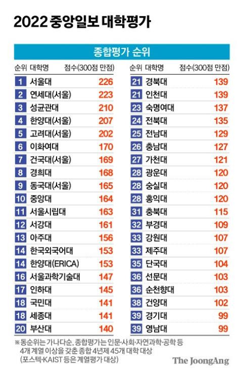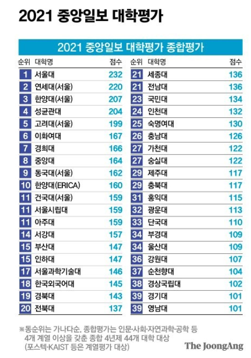 해마다 중앙일보에서 발표하는 대학 순위입니다.