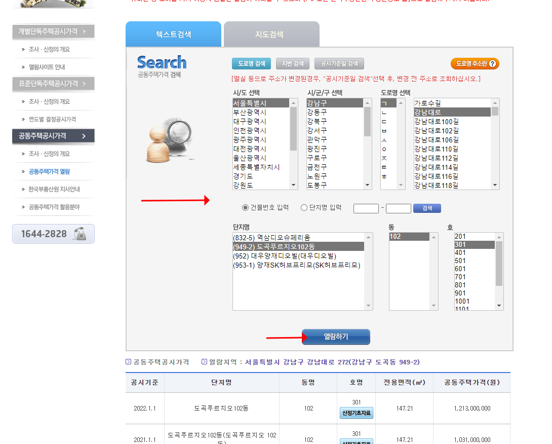 텍스트검색으로 공동주택가격 열람시