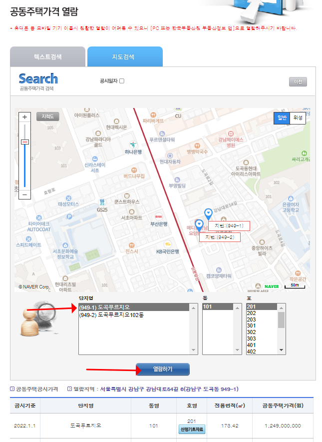지도검색으로 공동주택가격 열람시