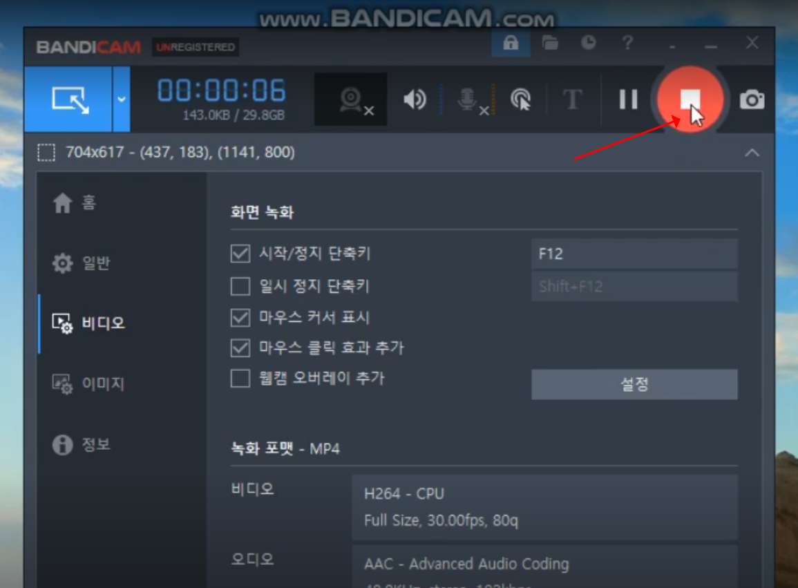 WWW.BANDICAM.COM 이라고 워터마크가 생깁니다.