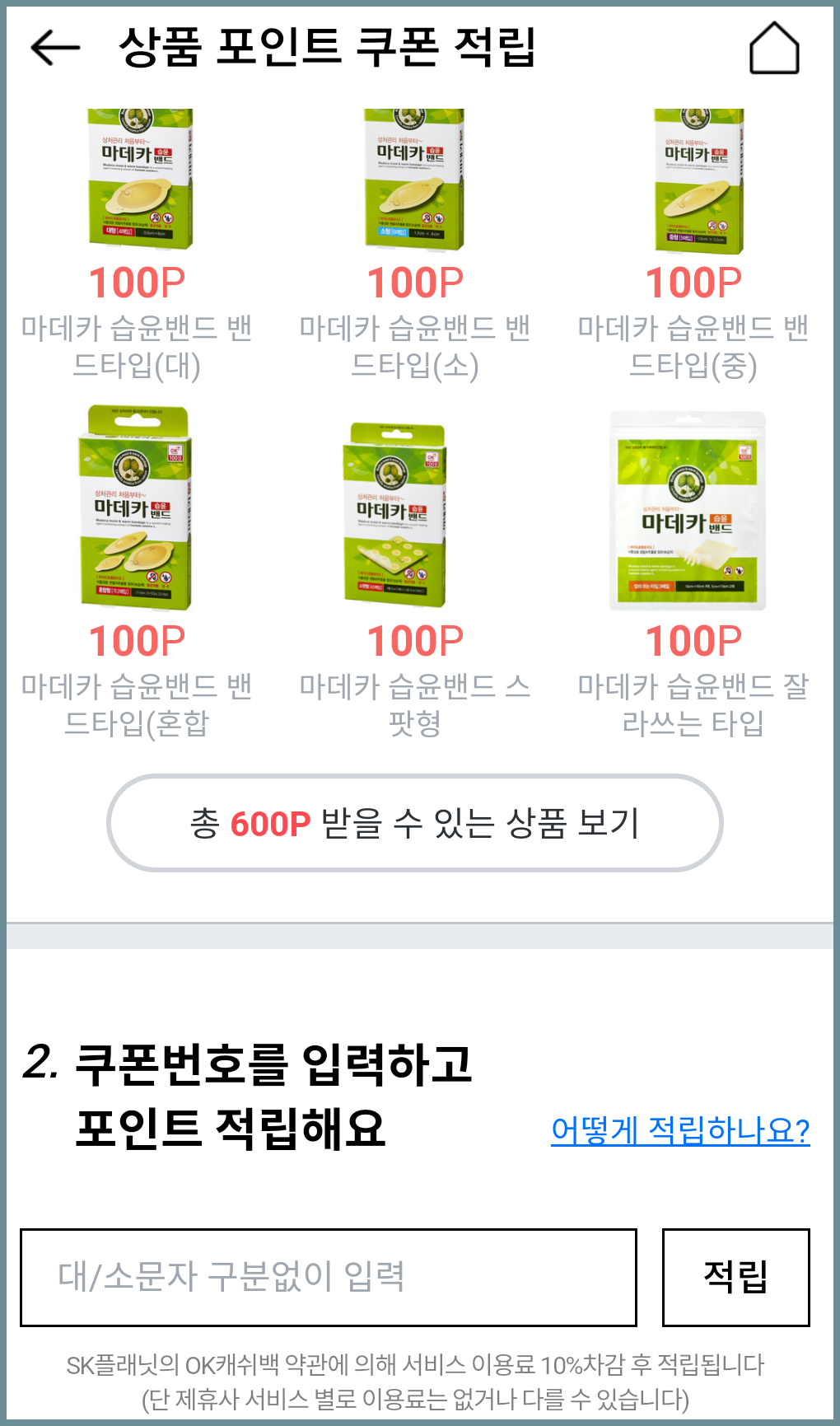 하단에 "쿠폰번호를 입력하고 포인트 적립해요" 가 있는 란에