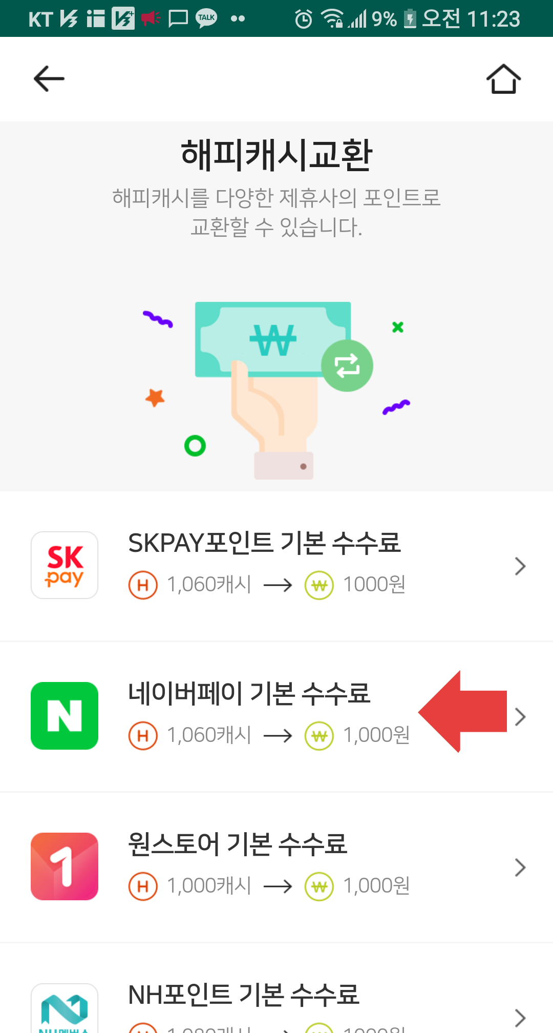 7) 메인화면에서 캐시교환 버튼을 누른후 네이버페이를 클릭합니다.