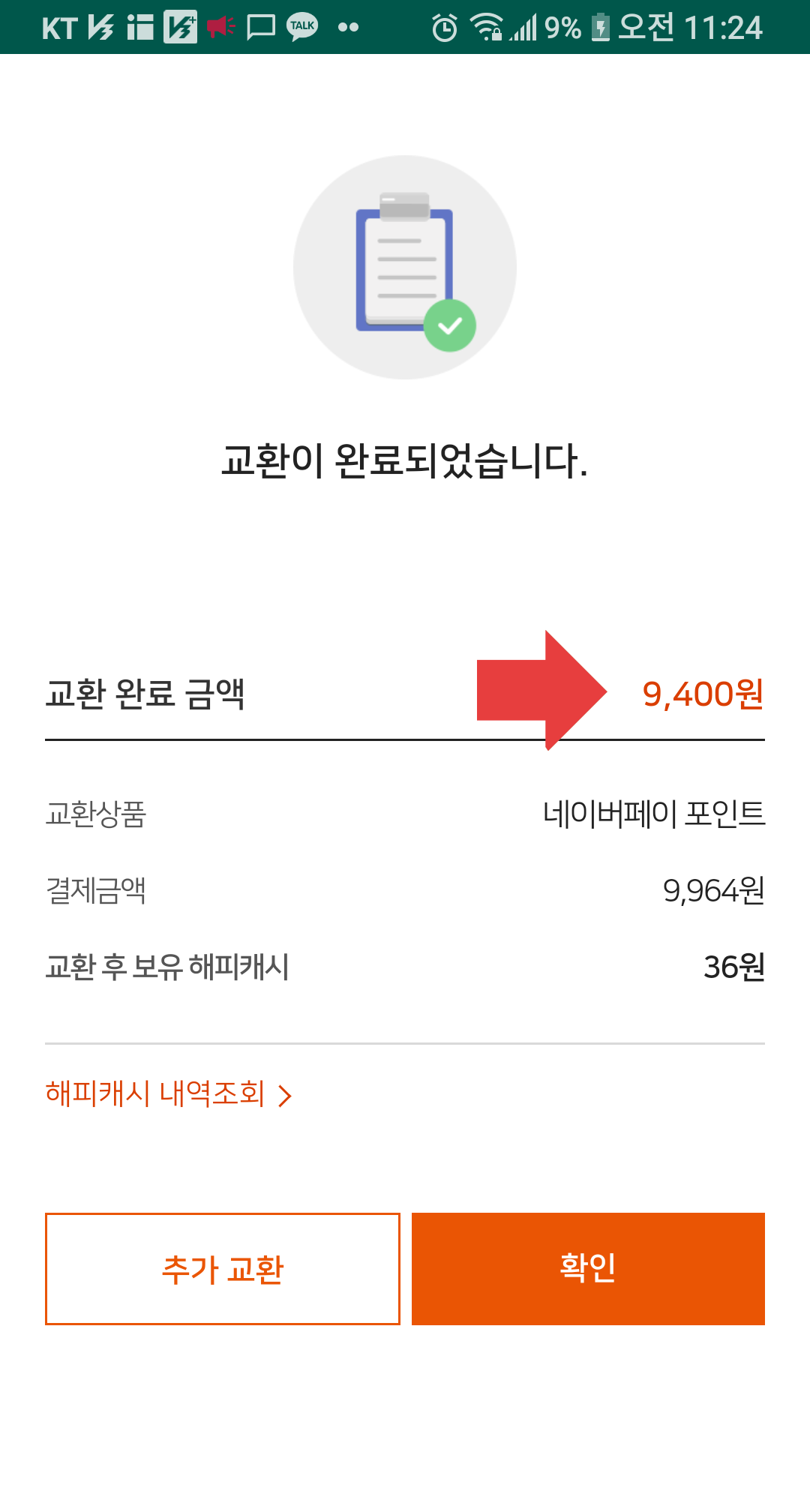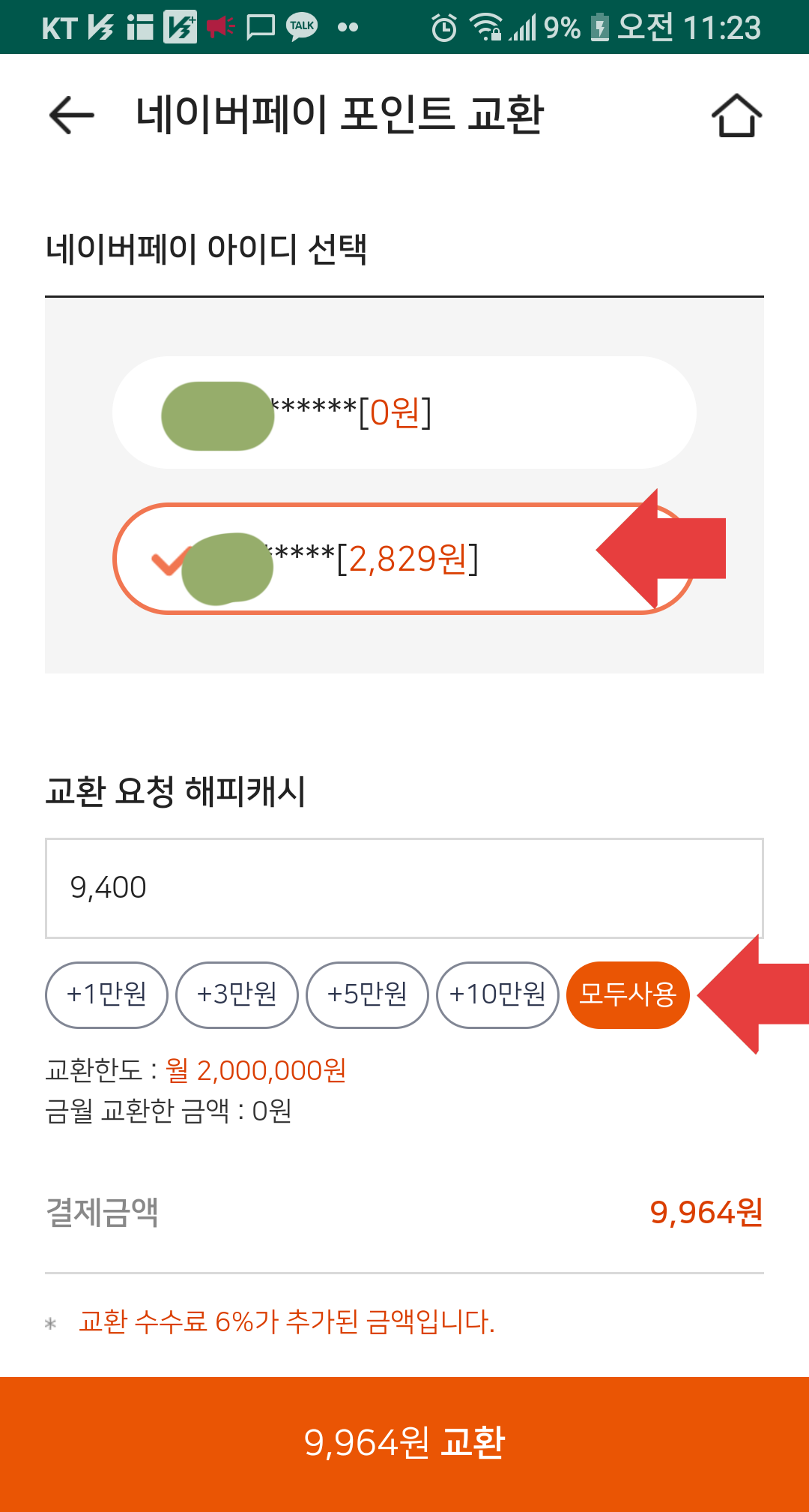 9) 그리고 교환버튼을 누르면 교환수수료 6%가 자동차감되어 네이버페이에 자동 입금됩니다.