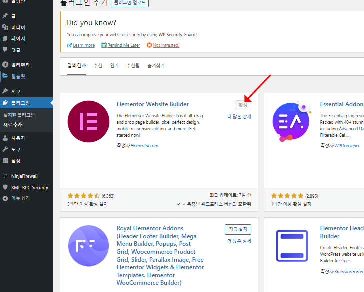 플러그인에서 elementor 를 추가 하려고 합니다.