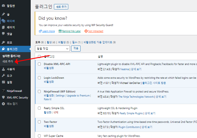 [플러그인] 에서 [새로추가]를 클릭하세요